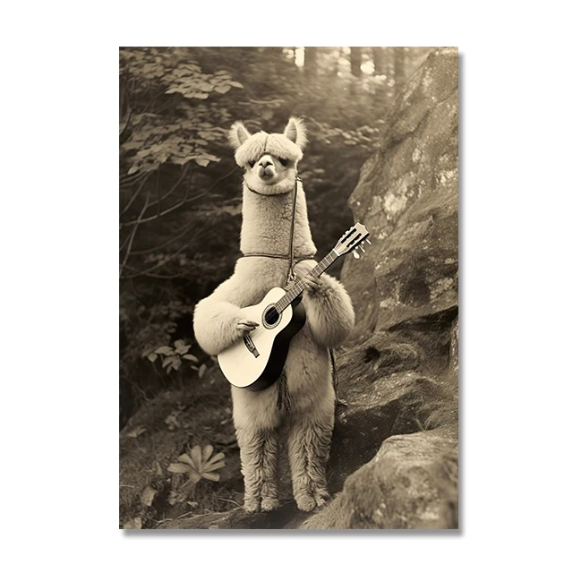 Funny Vintage Animal Print Canvas Painting Alpaca Playing Guitar Posters Retro Cat Humor Wall Art Pictures for Home Decor Mural
