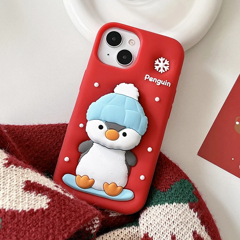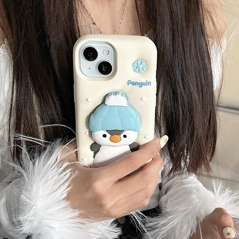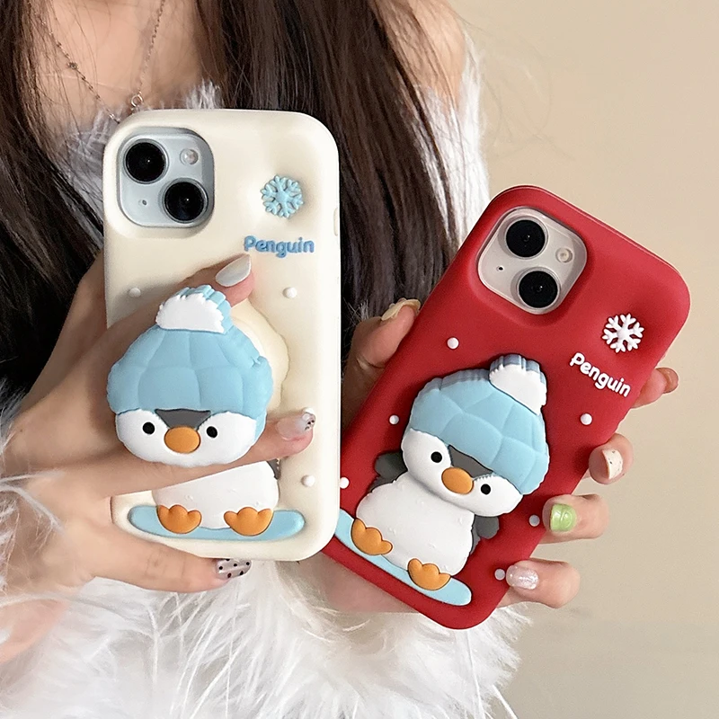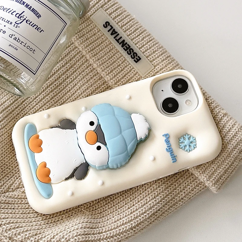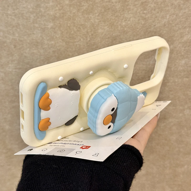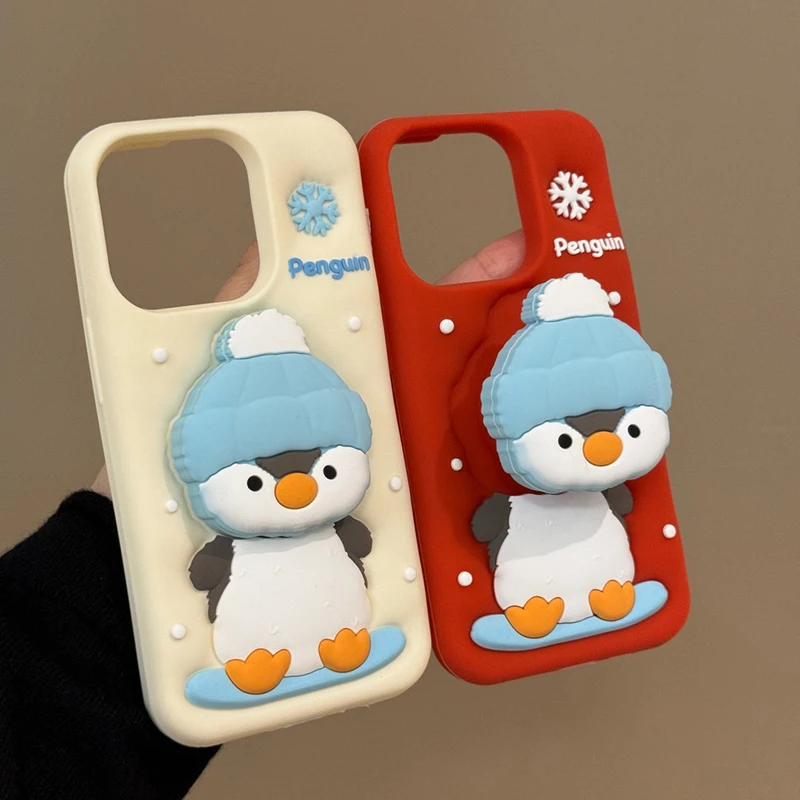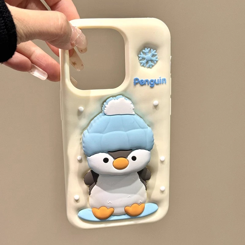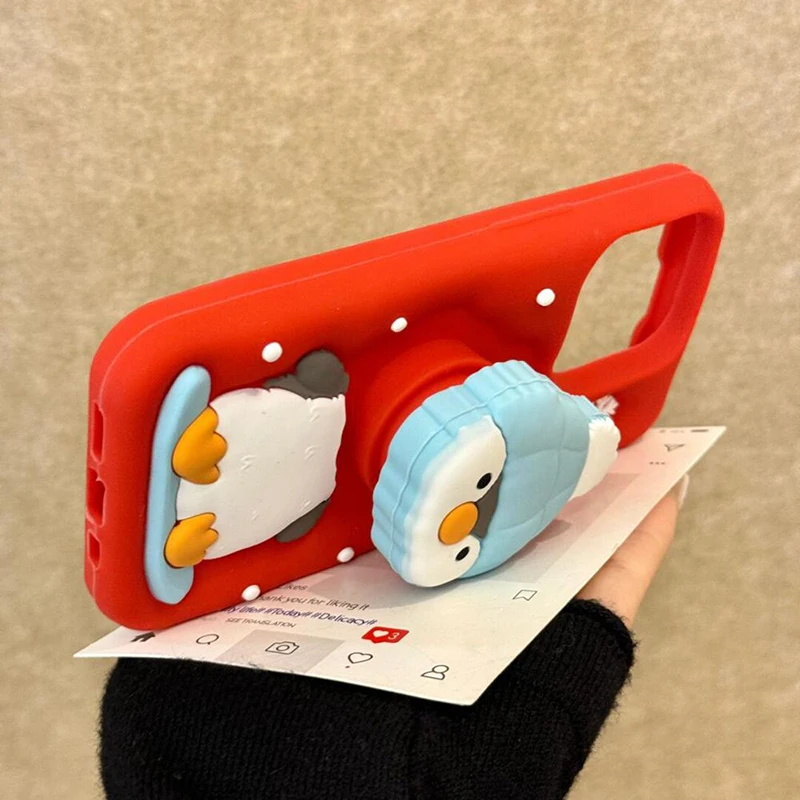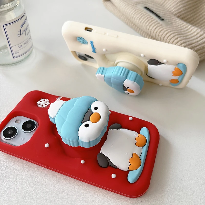 3D Cute Penguin Folding Bracket Soft Silicone Phone Case For iPhone 16 15 14 13 12 Pro Max Cartoon Christmas Kickstand Cover